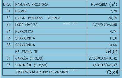 Stan F-B nalazi se na prvom katu zgrade F i obuhvaća ukupnu površinu od 73,84 m², uključujući stambeni dio, lođu, garažno parkirno mjesto i spremište.