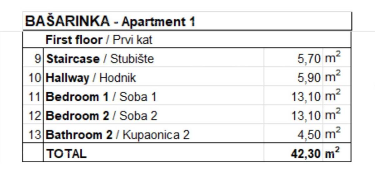 S prvog kata se dolzi stubištem iz prizemlja i uključuje hodnik koji povezuje dvije ugodne spavaće sobe. Svaka spavaća soba pruža udobno utočište, idealno za odmor i opuštanje. Kat također uključuje dodatnu kupaonicu, što pruža praktičnost za stanare.