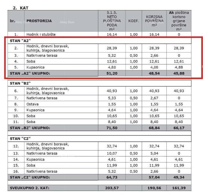 Stan A2, površine 52,10 m2 (neto korisne površine 48.54 m2) sastoji se od kuhinje s dnevnim boravkom i blagavaonom, spavaće sobe, kupaone i natkrviene terase.