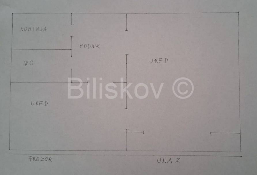 Funkcionalan poslovni prostor sastoji se od dvije prostorije, hodnika, kuhinje i sanitarnog čvora. Tlocrt je praktičan i omogućuje fleksibilnost u uređenju te prilagodbu različitim poslovnim djelatnostima.