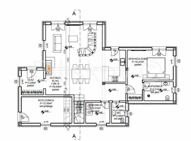 U prizemlju se nalazi prostrani ulazni prostor i stubište (8,08 m2), kuhinja blagovaonica i dnevni boravak (50,84 m2), spavaća soba (16,47 m2), kupaonica (5,51), wc (2,88 m2), praonica (4,91 m2) , kotlovnica (12,99 m2).