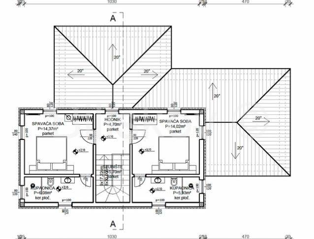 Na prvom katu se nalazi stubište koje zauzima 5,70 m2, dvije kupaonice (6,08  i 5,93 m2) te dvije spavaće sobe (14,37  i 14,02  m2).
