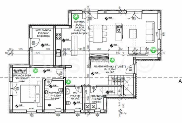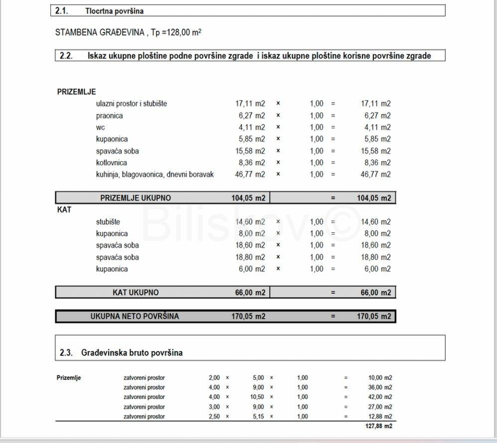 U prizemlju se nalazi prostrani ulazni prostor i stubište (17,11 m2), kuhinja blagovaonica i dnevni boravak (46,77 m2), spavaća soba (15,58m2), kupaonica (5,85), wc (4,11 m2), praonica (6,27 m2) ,kotlovnica( 8,36 m2).