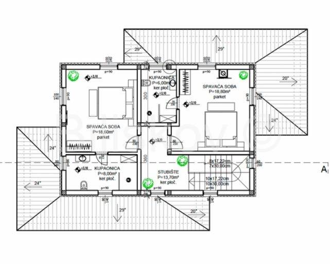 Na prvom katu se nalazi stubište koje zauzima 14,60 m2, dvije kupaonice (8 i 6 m2) te dvije spavaćesobe (18,60 i 18,80 m2).