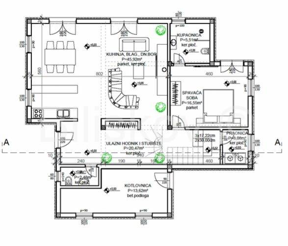 U prizemlju se nalazi prostrani ulazni prostor i stubište (20,47  m2), kuhinja blagovaonica i dnevni boravak (45,92 m2), spavaća soba (16,55 m2), kupaonica (5,51), wc (2,48 m2), praonica (3,08 m2) , kotlovnica( 13,62 m2).