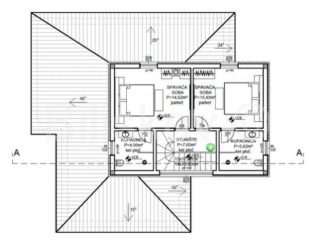 Na prvom katu se nalazi stubište koje zauzima 7,65 m2, dvije kupaonice (4, 95 i 5,62 m2) te dvije spavaće sobe (14,62  i 13,43  m2).