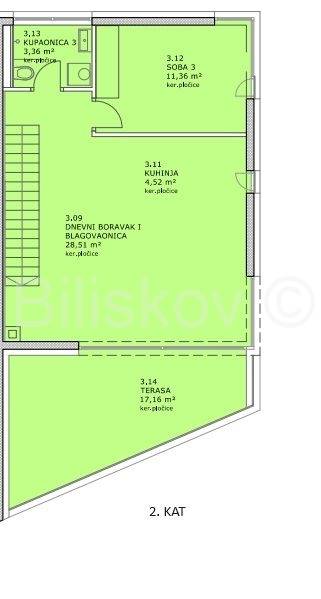 Na 2. katu stana nalazi se „open space“ dnevni boravak s kuhinjom i blagovaonicom, spavaća soba, kupaonica s wc-om te nenatkrivena terasa površine 17,16 m2 (NKP 4,29 m2).