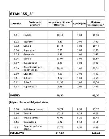 Ukupna bruto korisna površina stana s pripacima iznosi 216,02 m2.