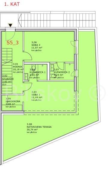 Prvi kat stana sastoji se od ulaznog hodnika, dvije spavaće sobe s vlastitim kupaonicama i izlazom na natkrivenu terasu površine 30,74 m2 (NKP 15,37 m2). Jednoj spavaćoj sobi uz već spomenutu kupaonicu pripada i garderoba.