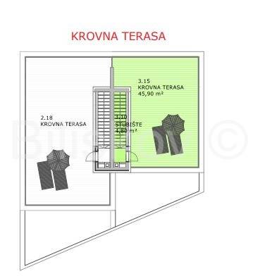 Krov zgrade je rezerviran za prekrasnu terasu površine 45,90 m2 (NKP 11,48 m2) s koje se pruža prekrasan panoramski pogled na more i otoke.