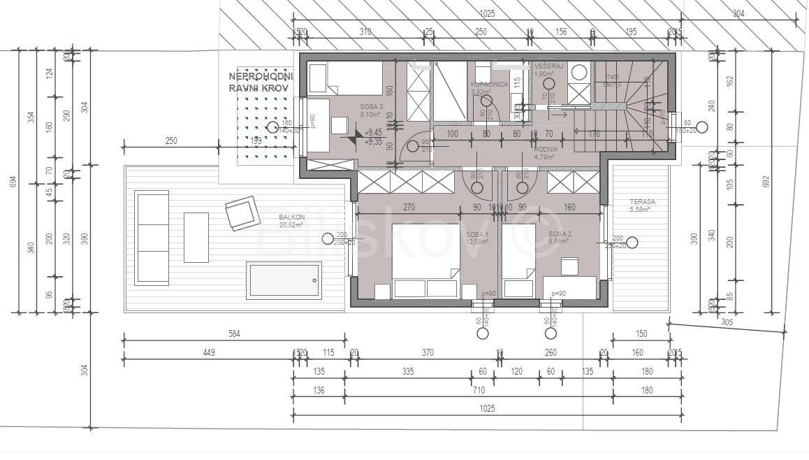 Na drugoj etaži nalaze se hodnik(4,79 m2), soba 1 (12,58 m2) s izlazom na veliki balkon površine 20,52 m2 (NKP 5,13 m2), soba 2 (8,84 m2) s izlazom na manju terasu površine 5,58 m2 (NKP 1,40 m2), soba 3(9,10 m2), kupaonica s wc-om (3,82 m2) i vešeraj (1,90 m2).