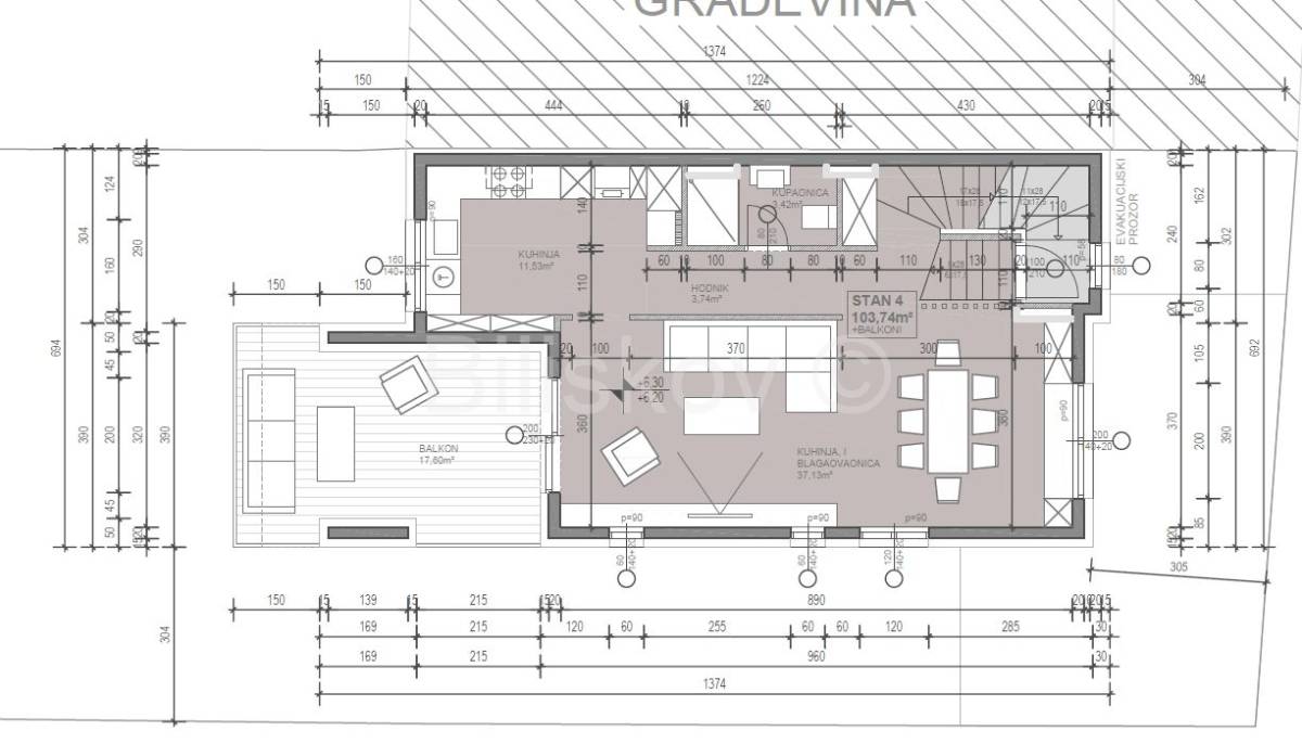 Četverosoban dvoetažan stan na drugom i trećem katu površine 119,07 m2 u zgradi čiji se završetak gradnje očekuje u 5. mjesecu 2025. godine.