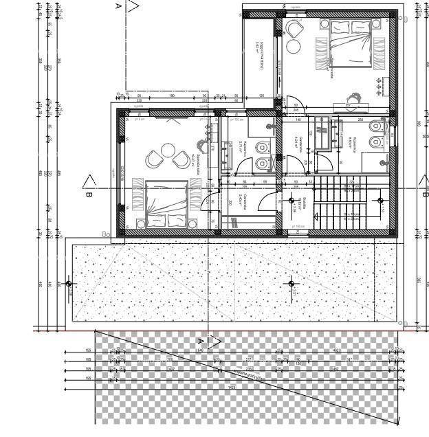Stubište vodi do prvog kata, gdje se nalazi: garderoba, spavaća soba, kupaonica i loggia sa jedne strane, a sa druge još jedna garderoba, spavaća soba i kupaonica.