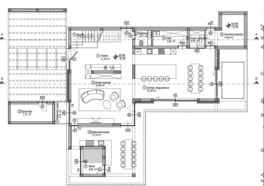 Kuća se sastoji od prizemlja i prvog kata. Prizemlje uključuje hodnik, kuhinju i blagavaonicu, dnevni boravak, saunu, spremište, sanitarije/toalet, ulitilty/vešeraj, vinsko spremište, tehničku prostoriju i natkrivenu terasu. Stubište vodi na kat koji uključuje, hodnik, 4 spavaće sobe sa en suite kupaonama i veliku terasu na koju imaju izlaz 3 spavaće sobe.