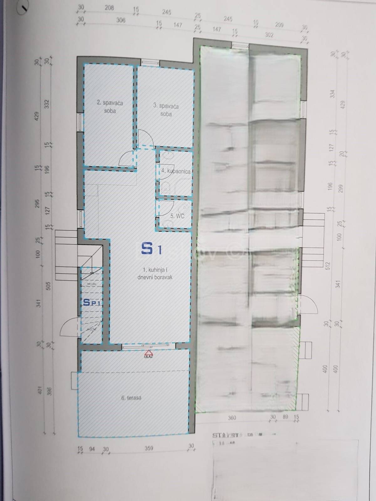 Stan S1, trosoban stan u prizemlju kuće, ukupne korisne površine 65,76 m², sastoji se od open-space kuhinje s dnevnim boravkom, dvije spavaće sobe, WC-a i kupaonice, terase, vrta, spremišta, te parkirnog mjesta. Na tlocrtu označeno plavom bojom.