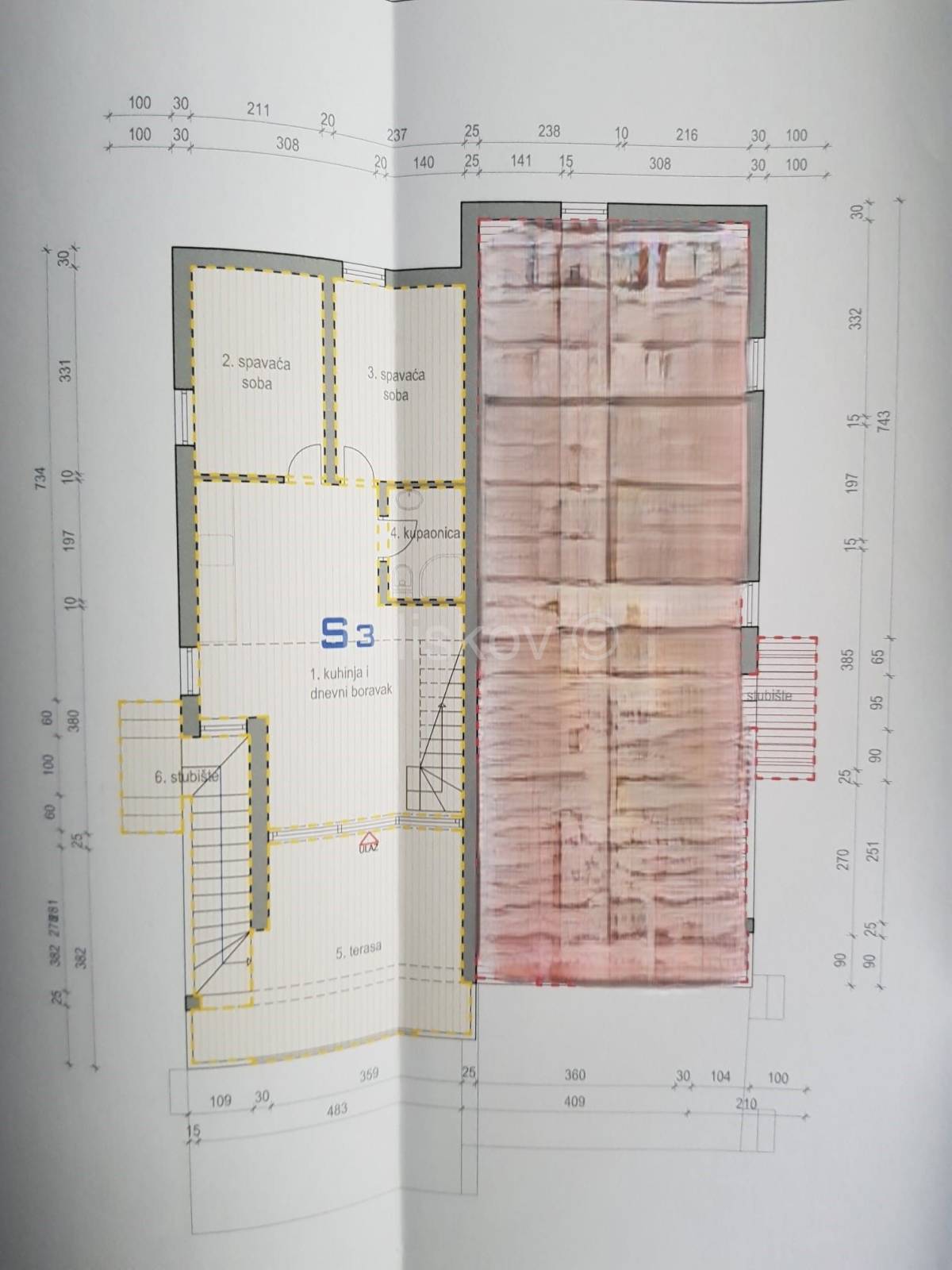 Stan S3, dvoetažni trosoban stan smješten na prvom katu i potkrovlju, ukupne korisne površine 71,46 m², sastoji se od open-space kuhinje s dnevnim boravkom, dvije spavaće sobe, kupaonice, galerije, terase, stubišta, dvorišta i vrta. Na tlocrtu označeno žutom bojom.