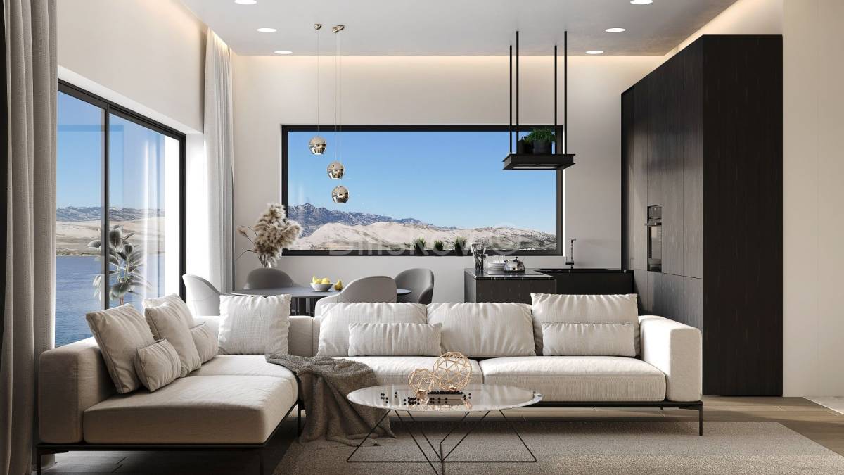 Stan se sastoji od predsoblja, prostranog dnevnog boravka i kuhinje otvorenog koncepta sa kliznom stijenom koja nudi neopisivi panoramski pogled na more, terase sa izlazom na bazen, dvije spavaće sobe, kupaonice i zasebnog WC-a.