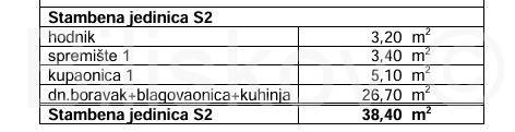 Prizemlje se prostire na 38,40 m2 sastoji se od hodnika, spremišta, kupaonice i „open space“ kuhinje, blagovaonice i dnevnog boravka s izlazom na prekrasnu terasu s bazenom dimenzija 6x3 m. Unutarnjim stubištem se dolazi na kat površine 44,20 m2 koji se sastoji od hodnika, 3 spavaće sobe i kupaonice.