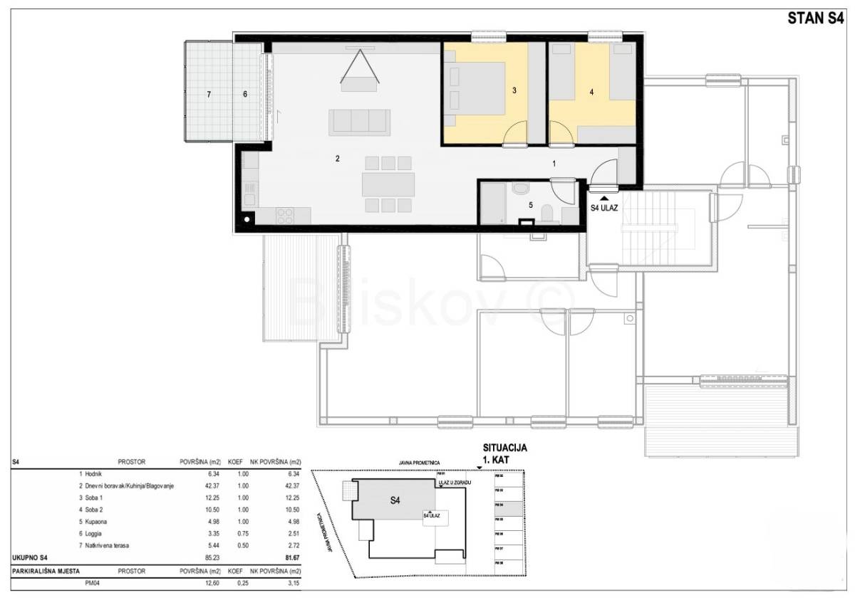 Stan (S4) sastoji se od ulaznog prostora, „open space“kuhinje, blagovaonice i dnevnog boravka, dvije spavaće sobe, kupaonice, loggie i balkona.