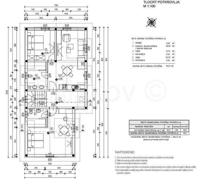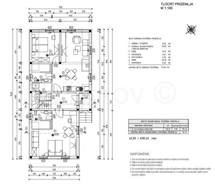 Samostojeća apartmanska kuća površine 206 m2 izgrađena 2019. godine na parceli površine 1000 m2. Sastoji se od prizemlja i kata na kojima se nalaze četiri apartmana.