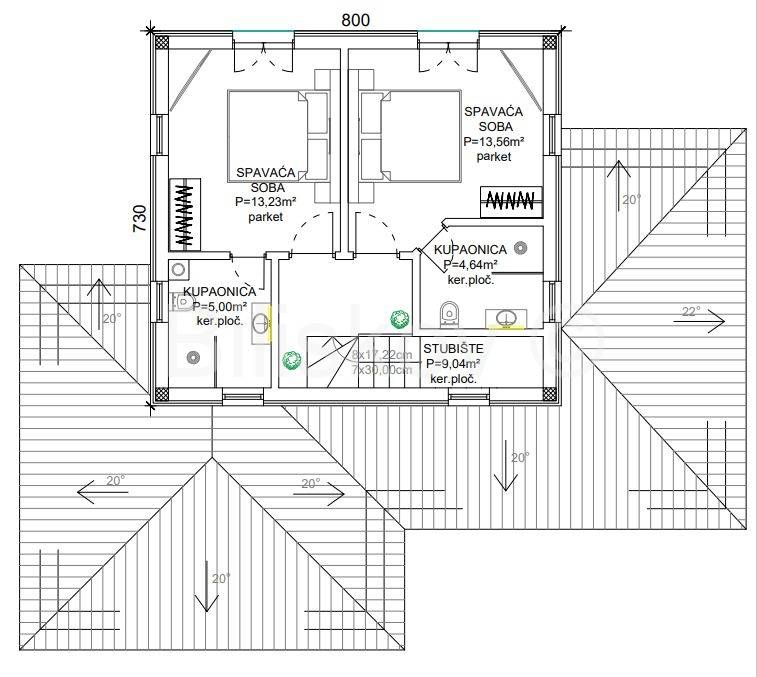 Na prvom katu se nalazi stubište koje zauzima 9,04 m2, dvije kupaonice (5 i 4,64 m2) te dvije spavaće sobe (13,23 i 13,56 m2).