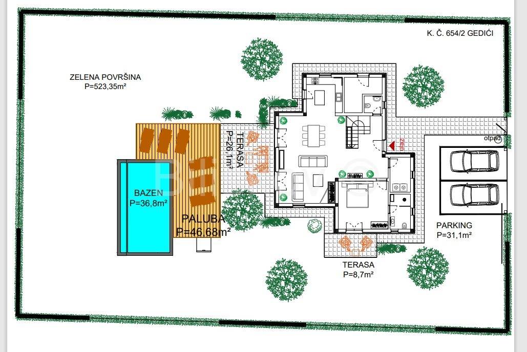 Uz vilu dolaze i dva natkrivena parkirna mjesta (ukupno 31m2).