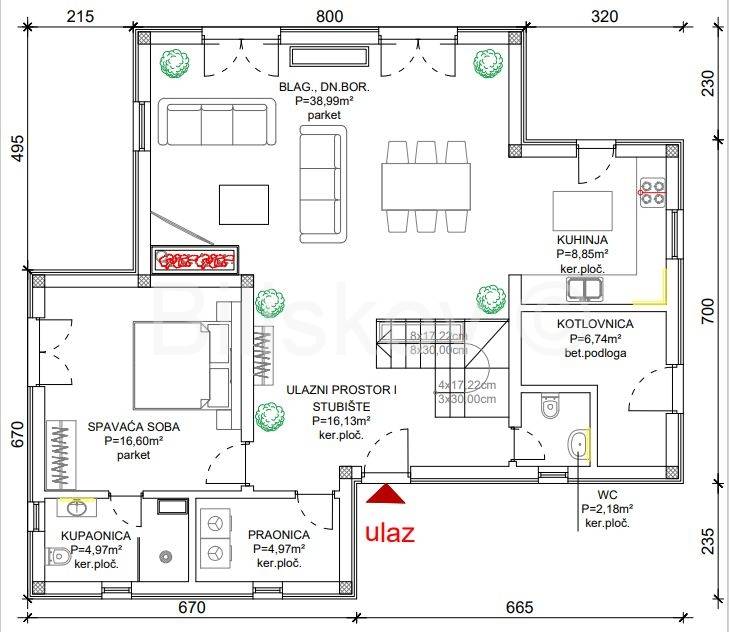 U prizemlju se nalazi prostrani ulazni prostor i stubište (16,13 m2), kuhinja ( 8,85 m2) blagovaonica i dnevni boravak (38,99 m2), spavaća soba (16,60m2), kupaonica (4,97 m2), wc (2,18 m2), praonica (4,97 m2), kotlovnica( 6,74 m2).