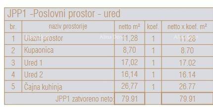 Poslovni prostor JPP1, nalazi se u prizemlju južnog dijela i sastoji se od ulaznog prostora, kupaone, 2 ureda i čajne kuhinje.