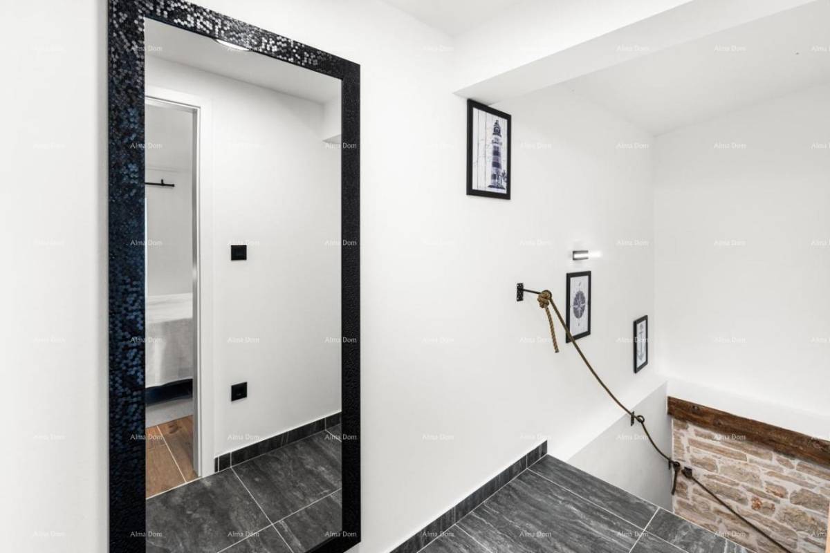 Kuća uključuje dnevni boravak sa kuhinjom i blagavaonom, 3 spavaće sobe, 3 kupaone, vešeraj, terasu koja ima vanjsku jedinicu za ručavanje (ljetnna kuhinja i roštilj) i vrt na kojem se nalazi bazen.