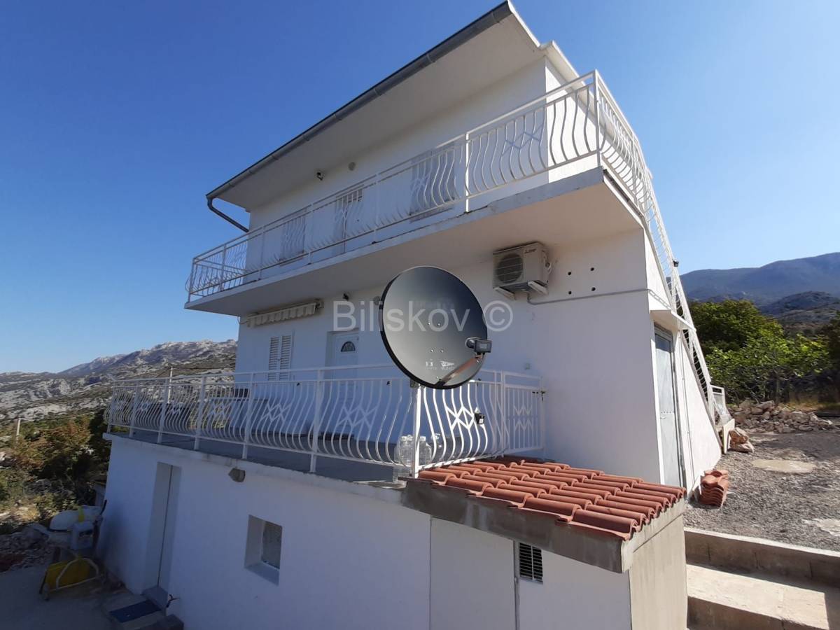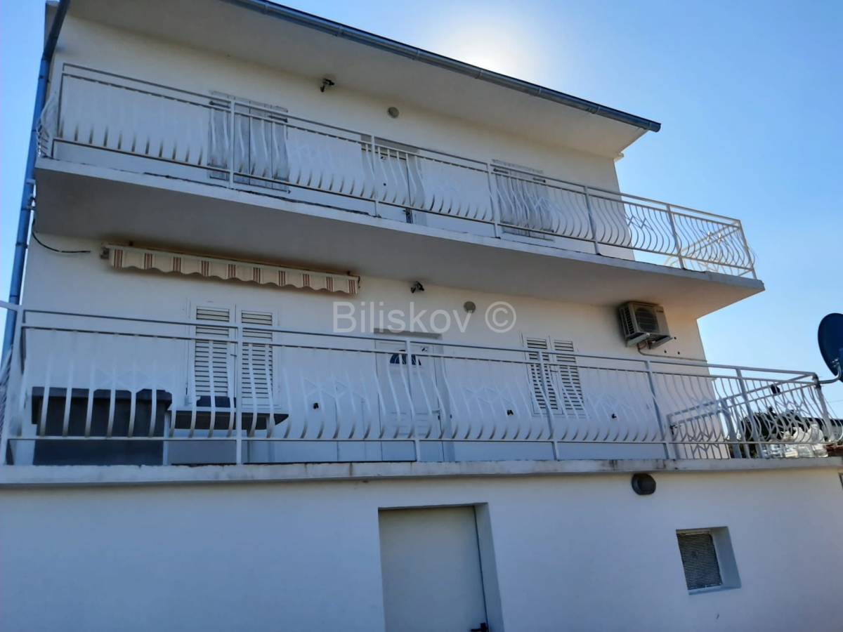 U prizemlju kuće smješten je kuhinja, wc i ostava s prekrasnom velikom terasom i vrtom s 11 maslina i mediteranskim biljem. Na prvome katu nalazi se dvosoban, kompletno namješten stan, s kuhinjom, blagovaonom i dnevni boravkom odakle je izlaz na lijepu i prostranu terasu. Vanjsko stepenište vodi na 2. kat kuće koji je u roh-bau stanju te se može urediti po želji budućeg vlasnika.
