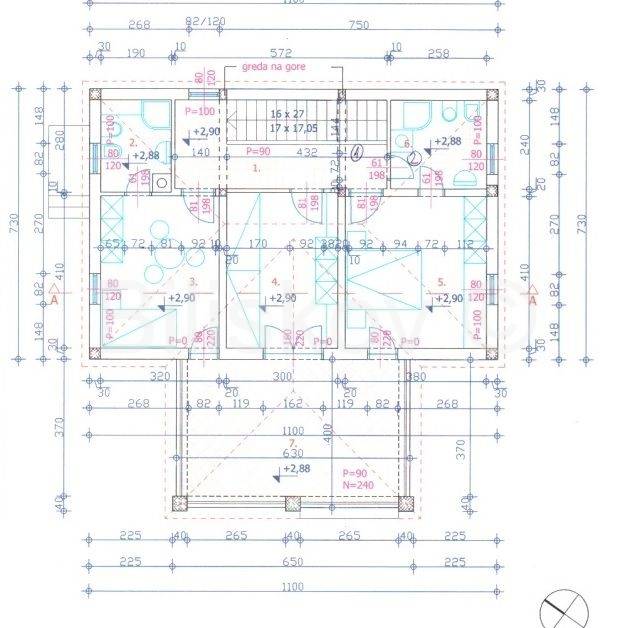Sastoji se od prizemlja i kata. U prizemlju je: hodnik, kuhinja integrirana sa blagovaonicom, prošireni dnevni boravak, spavaća soba „en suite“ dakle povezana sa kupaonicom i ostava. Kompletna etaža ima izlaz na natkrivenu popločanu terasu. Na katu su: tri spavaće sobe, tri kupaonice i predhodnik. I ova etaža ima izlaz na natkrivenu terasu. Sve sobe imaju orjentaciju Jug-Zapad. Svaka terasa je po 25m2. Kuća ima dva ulaza izvana, što je komparativna prednost.