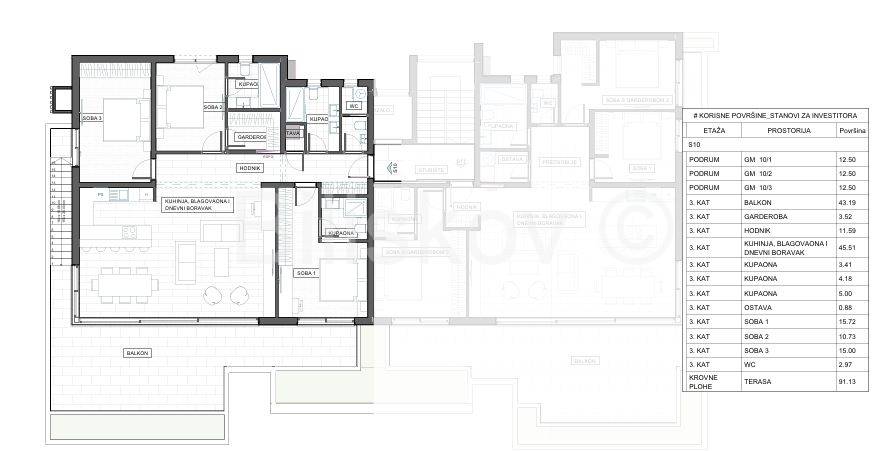 Dodatna vrijednost ovog stana su krovna terasa od 91,13 m², tri garažna parkirna mjesta što ga čini idealnim izborom za obitelj ili one koji cijene prostranost i udobnost.