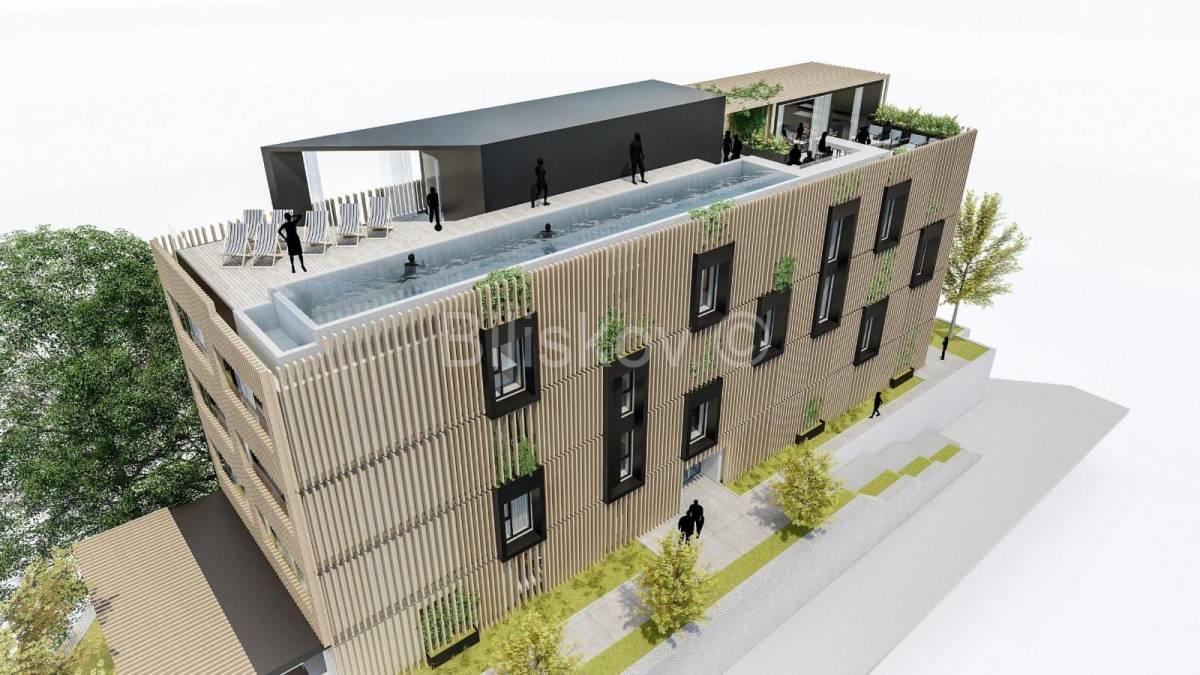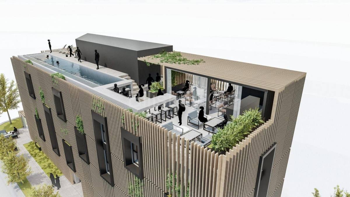 Dogradnja na krovnoj terasi predviđena je uglavnom kao čelična konstrukcija obložena profiliranim limom, s unutarnjom oblogom od gipskartonskih ploča. Zatvoreni dio dogradnje uključuje servisne prostore terase i bazena, dok se na dijelu terase planira nadstrešnica i pergola za zaštitu od sunca. Na etaži krova planira se bazen dimenzija 2,7 x 20 m i dubine 1,2 m. Uz bazen će se nalaziti povišeni dio sunčališta na čeličnoj potkonstrukciji, prekriven drvenim „deckingom“ ispod kojeg je smješten kompenzacijski i neutralizacijski bazen za pročišćavanje vode. Oko krovne terase i bazena postavit će se zaštitna, djelomično ostakljena ograda visine između 1,2 i 1,4 m.