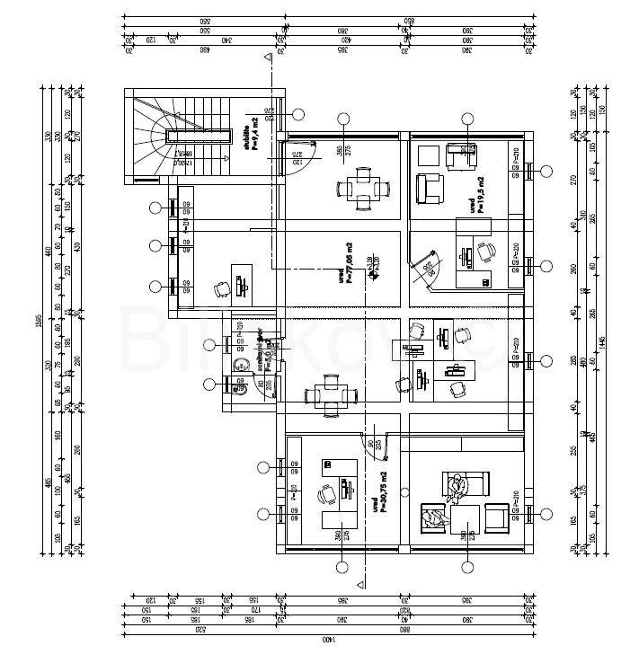 Prvi kat: ulaz sa stubišta, veći prostor, trenutno knjigovodstveni ured sa 6 radnih mjesta i 2 stola za stranke, dvije odvojene kancelarije, wc i čajna kuhinja. Na podu se nalazi laminat a strop je «Knauf» sa ugrađenom kvalitetnom rasvjetom, prostor klimatiziran (170 m2) .