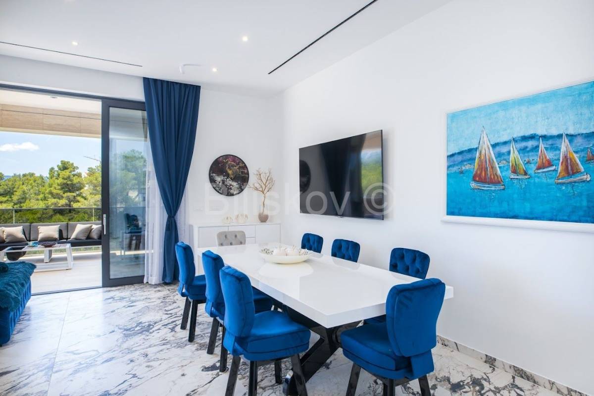 Sastoji se od dnevnog boravaka u sklopu kuhinje i blagovaone (otvoreni koncept) sa izlazom na veliku terasu gdje se nalazi grijani bazen i jacuzzi, tri spavače sobe i četiri kupaonice.