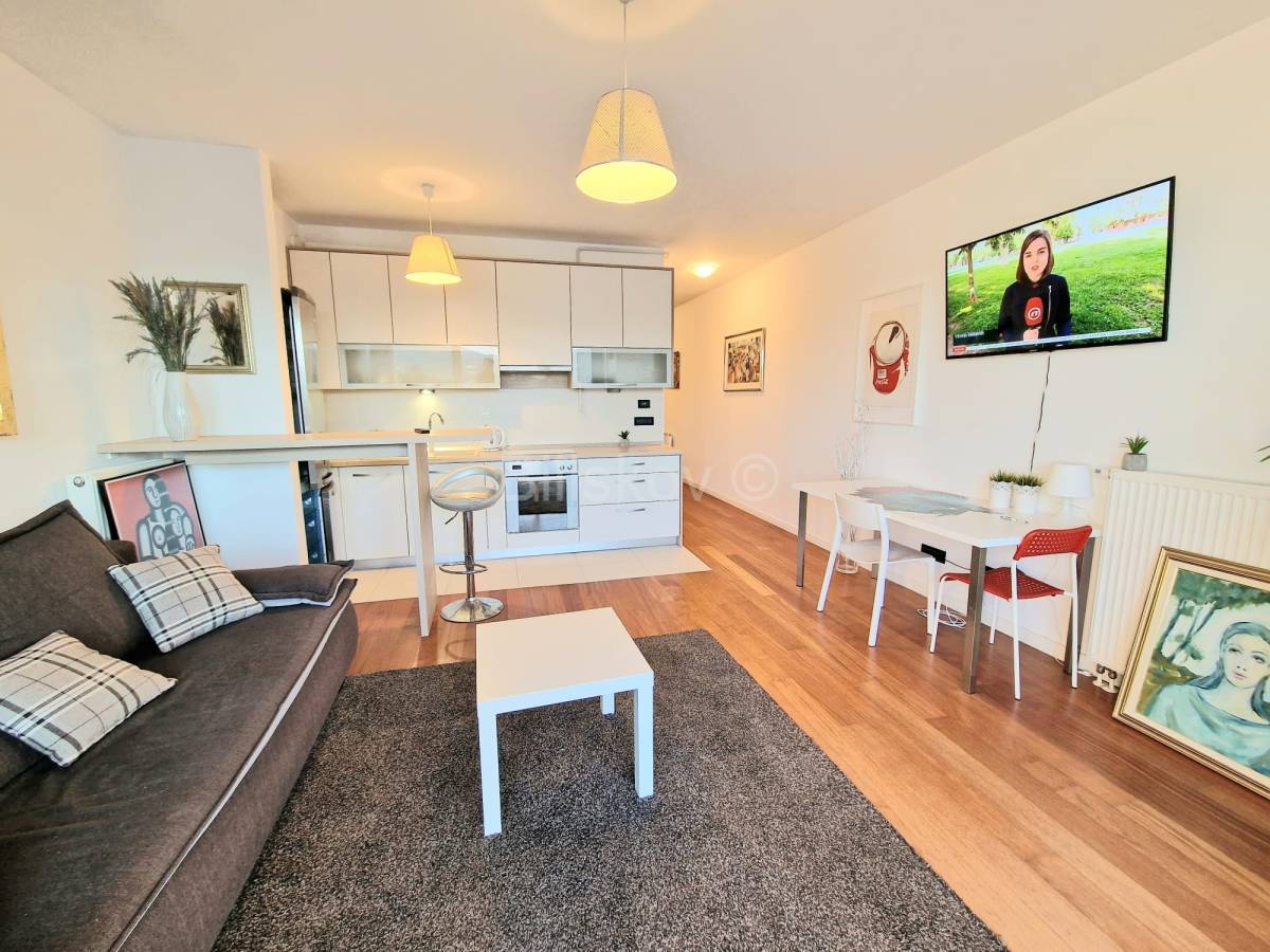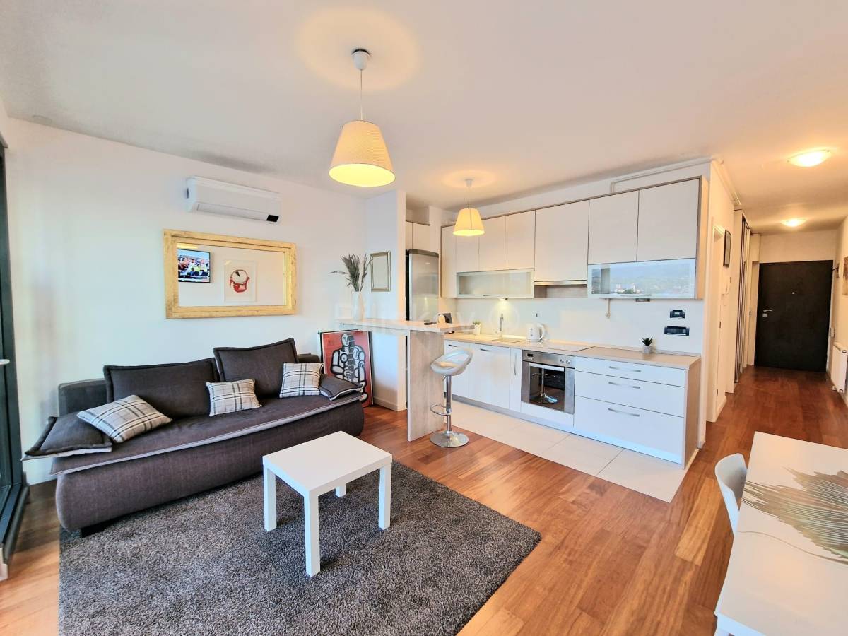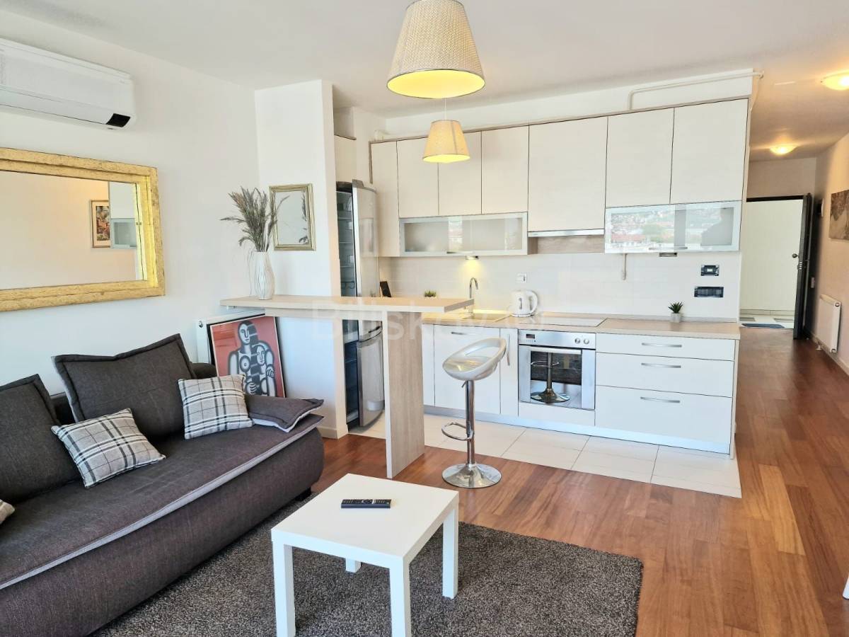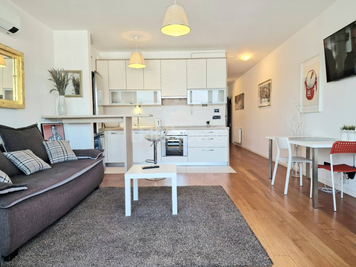 Moderno namješten jednosoban stan ukupne površine 45m2 smjestio se na šestom katu zgrade sagrađene 2008. godine. Zgrada ima lift.