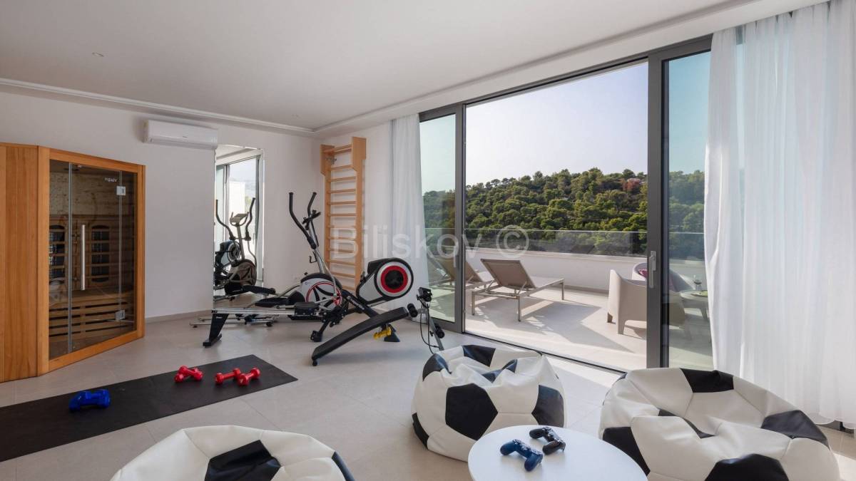 Na drugom katu su dvije spavaće sobe s kupaonicama te prostor gdje se nalazi sauna i mala teretana.