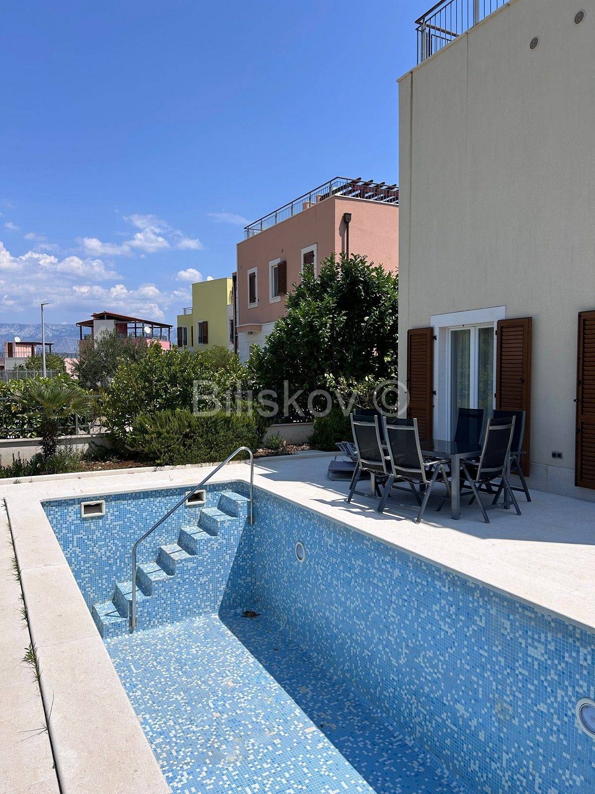 Uređen vrt i okućnica. Velika terasa na kojoj se nalazi bazen dimenzija 3x 8 m.