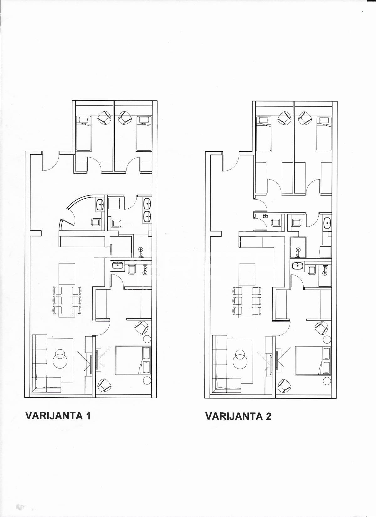 Priložena su tlocrtna rješenja za novi raspored stana i u tom slučaju moguća je prenamjene u čak četverosobni stambeni prostor.