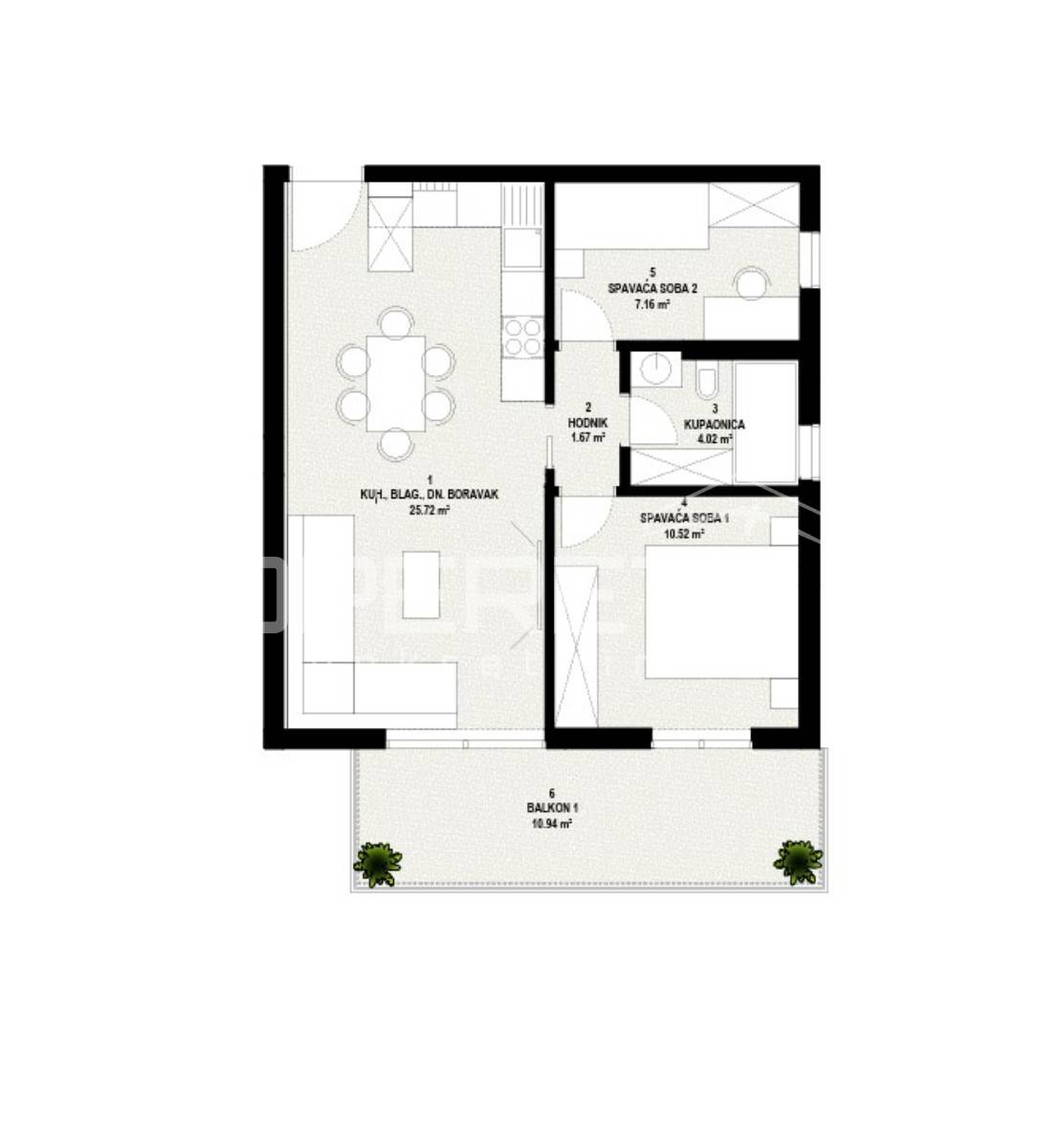 Dnevni boravak, kuhinja i blagovaonica čine otvoren i svijetao prostor ispunjen prirodnim svjetlom. Spavaća soba i dodatna soba pružaju mir i privatnost potrebnu za svakodnevni odmor. Stan ima jedan balkon koji omogućuje ugodan kontakt s vanjskim prostorom i mediteranskim načinom života.