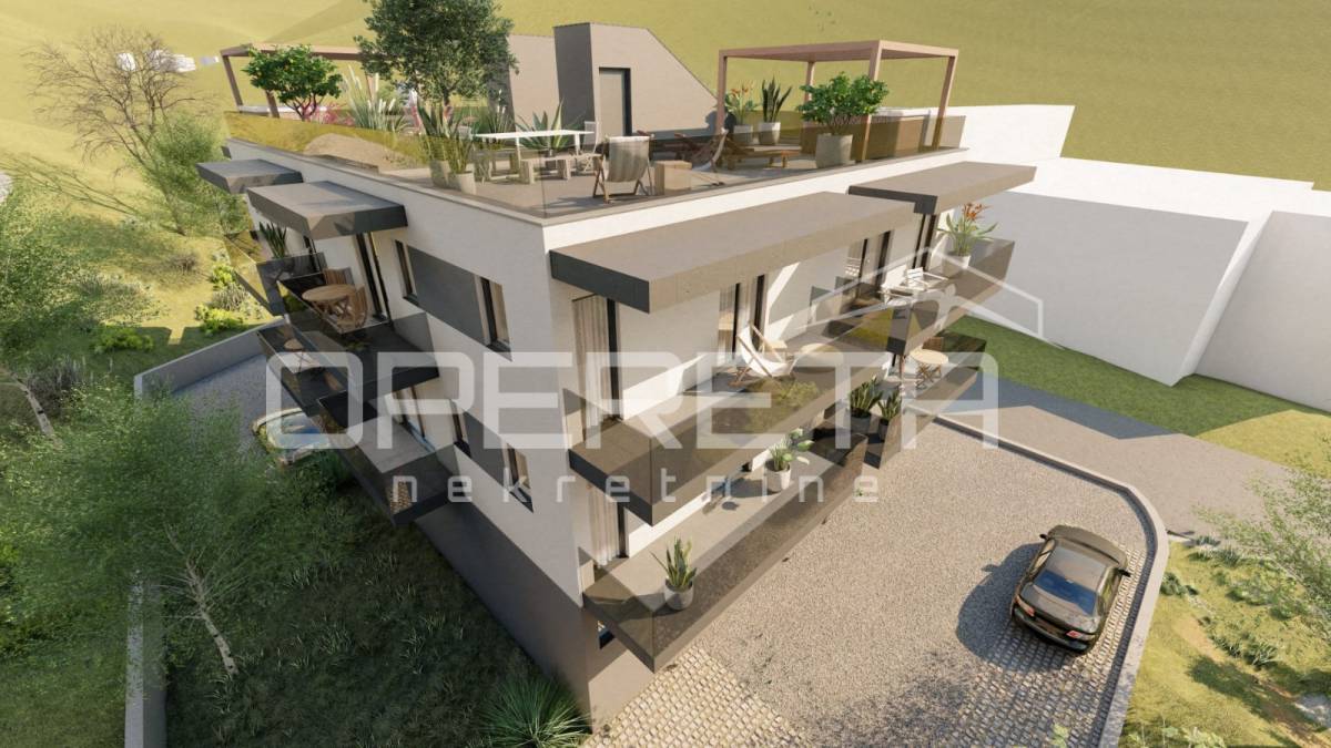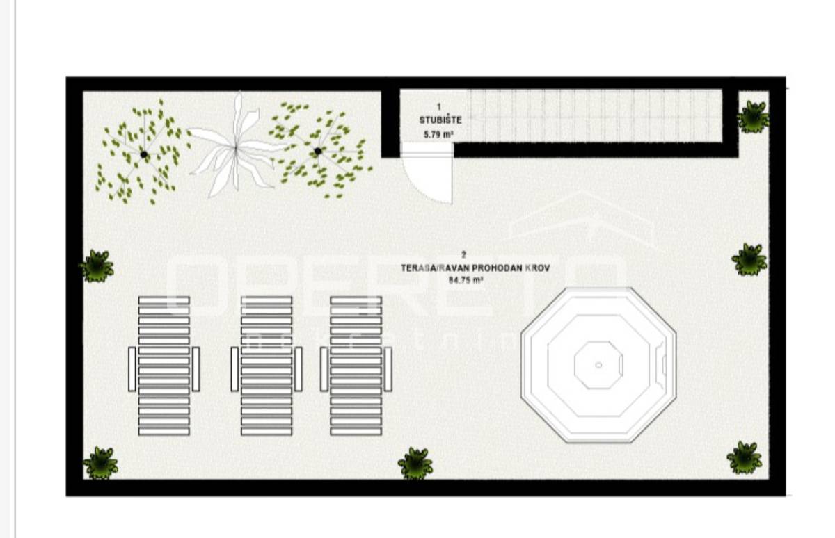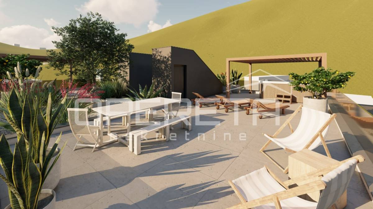 Stan raspolaže s tri balkona te prostranom terasom površine 106 m², idealnom za opuštanje, objedovanje na otvorenom ili druženja tijekom toplih mediteranskih večeri. Vanjski prostori dodatno naglašavaju osjećaj prozračnosti i povezanosti s okruženjem.