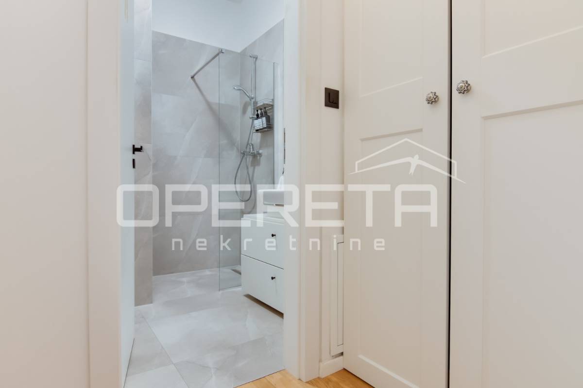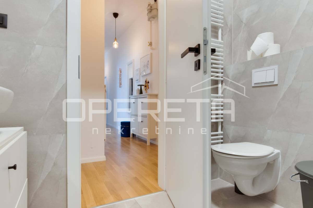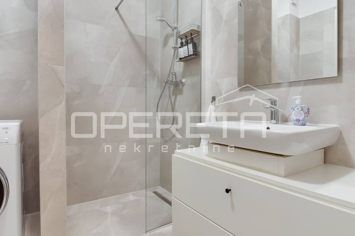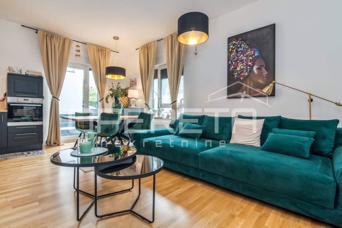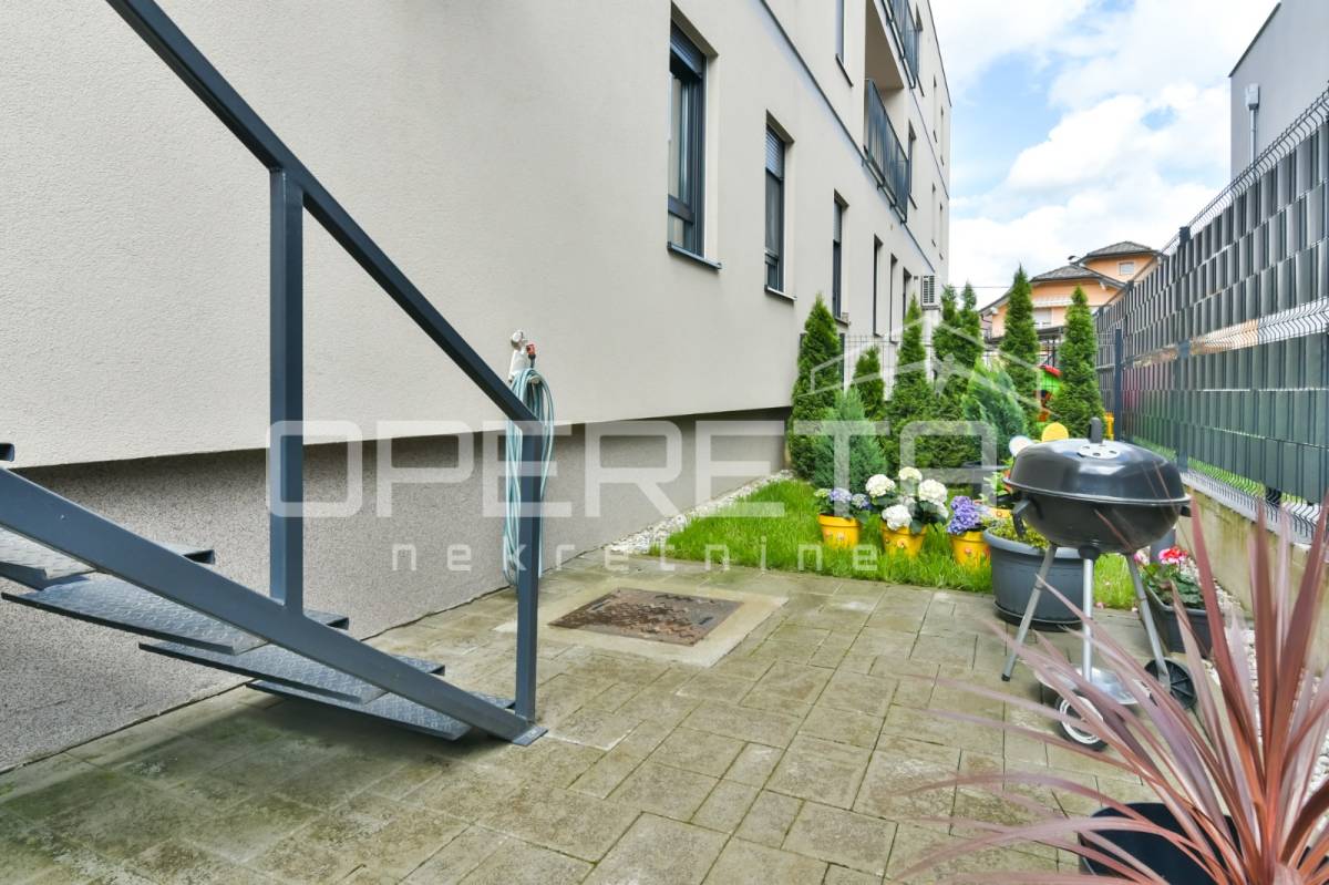 Sastoji se od ulaznog hodnika, dnevnog boravka s blagovaonicom i potpuno opremljene kuhinje s izlazom u uređen vrt s terasom (bruto 54,35 m2), garderobe, 2 spavaće sobe, kupaonice s walk-in tušem.