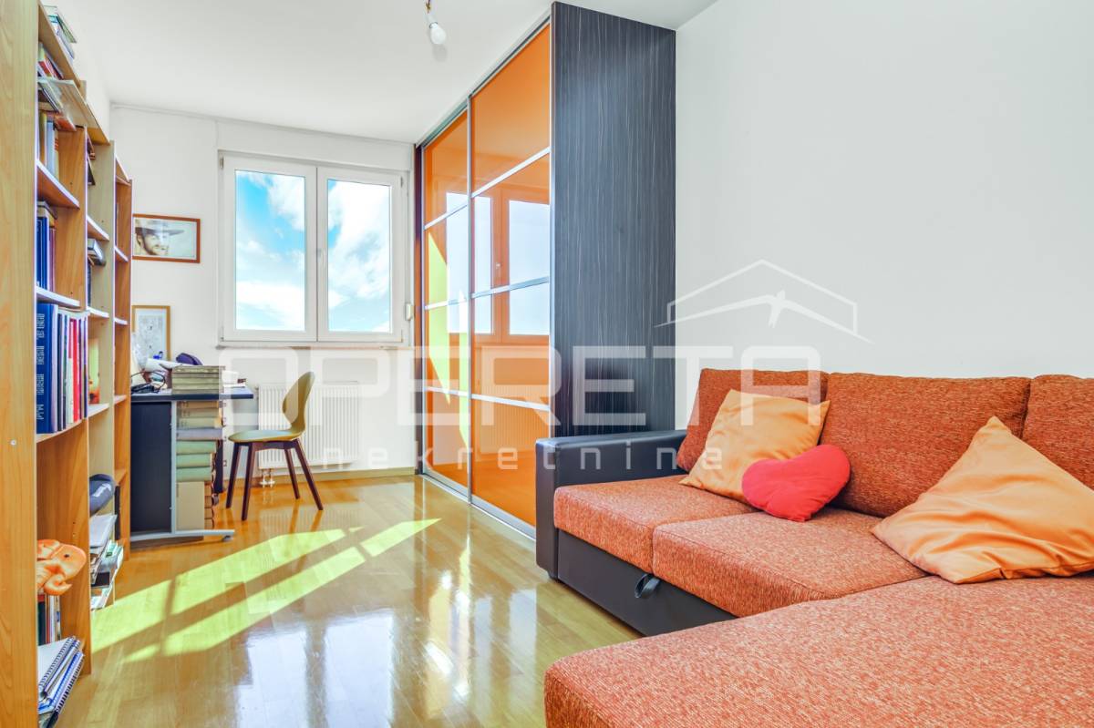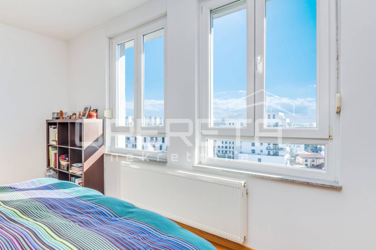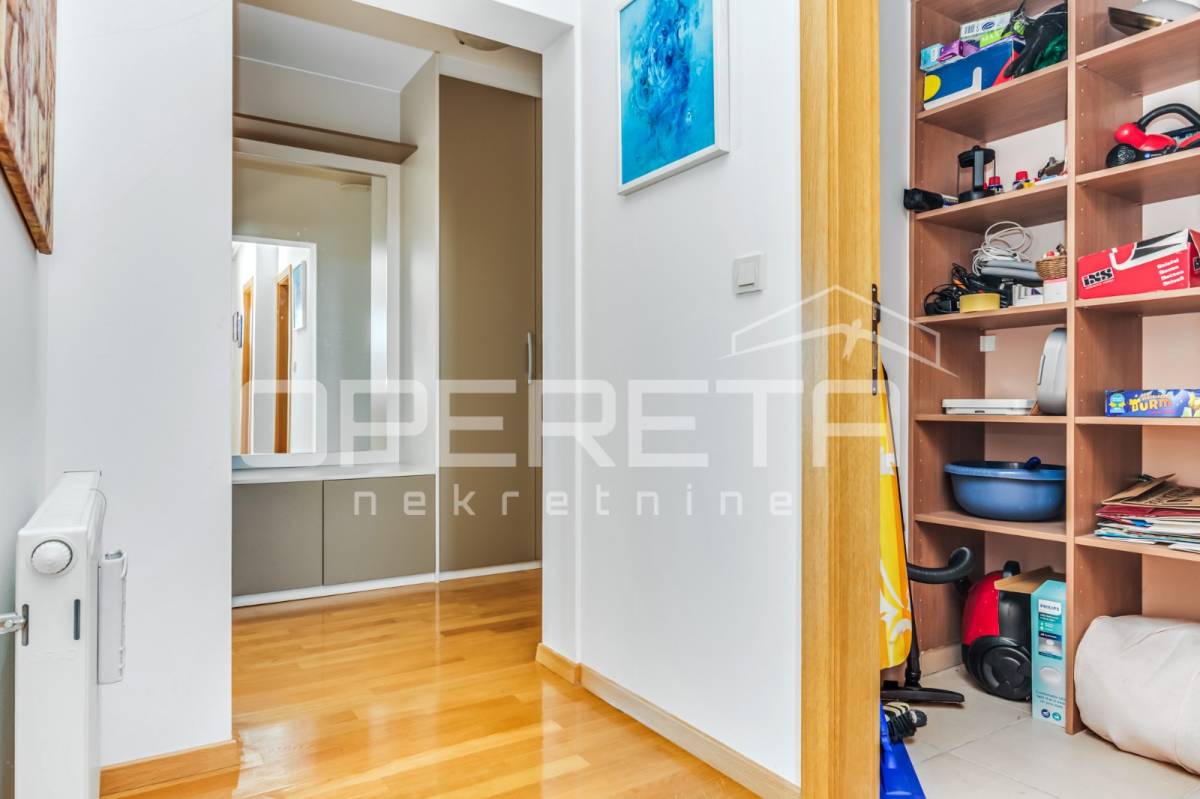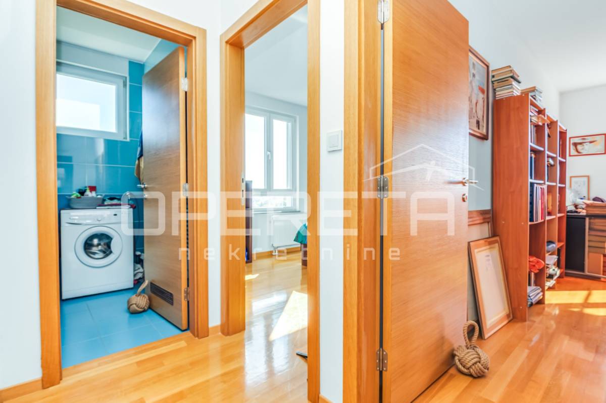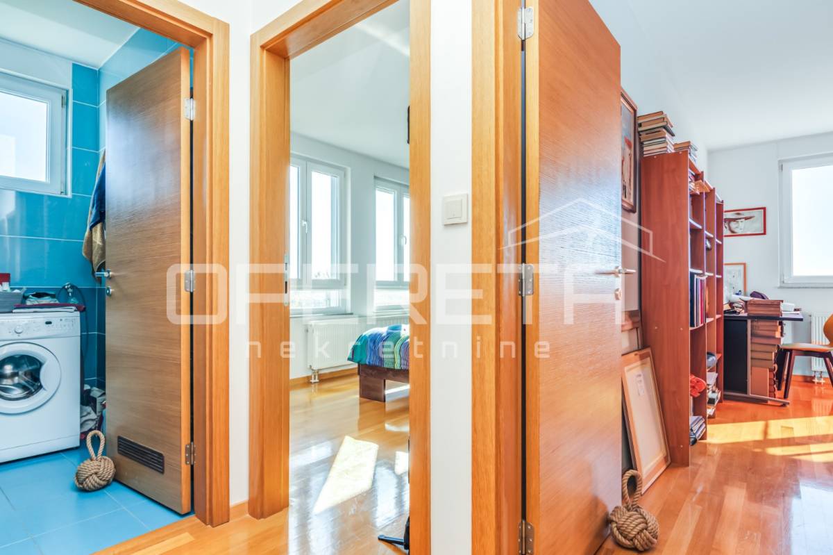 PRODAJA STANA, KNEŽIJA, Horvaćanska, 92,06 m2, prostran i svijetao trosoban stan smješten na sedmom, ujedno i zadnjem katu zgrade iz 2007. godine. Nalazi se na odličnoj poziciji u zgradi te ima prekrasan, otvoren pogled i tijekom cijeloga je dana ispunjen prirodnim svjetlom. Sastoji od prostranog ulaznog hodnika s ugradbenim ormarom, ostave, kupaonice s WC-om koja ima vlastiti prozor, dodatno zasebnog WC-a, dvije komforne spavaće sobe te velikog open space dnevnog boravka s blagovaonicom i kuhinjom te izlazom na loggiu. Trenutno stan funkcionira kao trosoban, no u originalnom projektu bio je zamišljen kao četverosoban, pa se vrlo jednostavnom intervencijom može vratiti u prvobitnu varijantu prema potrebama budućeg vlasnika. Zgrada je uredna, mirna, posložena i dobro održavana, a stan je odmah useljiv. Zbog svoje kvadrature, rasporeda, orijentacije i same mikrolokacije - stan je idealan i po mjeri jedne obitelji. Preporuka agencije!