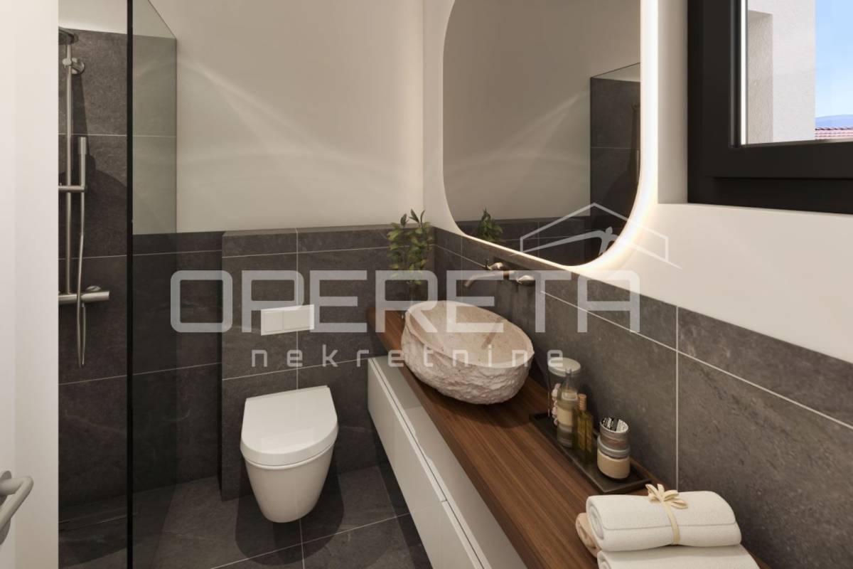 Stanu pripada i vlastito parkirno mjesto unutar kompleksa, a dodatnu vrijednost naglašava moderan sustav aluminijske stolarije s kliznim stijenama, izvrsna toplinska i zvučna izolacija te uređeni vanjski prostori oplemenjeni mediteranskim biljem. Sustav automatskog navodnjavanja i diskretna rasvjeta stvaraju ugodnu atmosferu i nakon zalaska sunca. Lokacija osigurava blizinu mora i centra mjesta, a ipak pruža mir i privatnost daleko od užurbanosti.