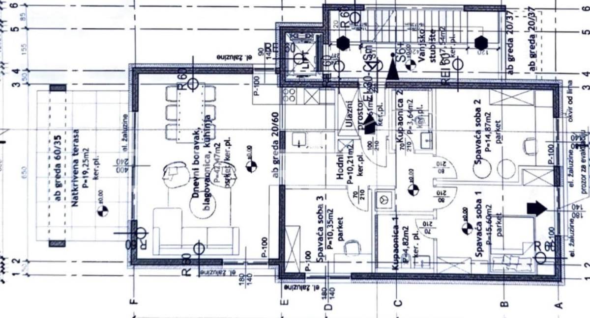 Stan se sastoji od ulaznog prostora, open space kuhinja/boravak (42,5m2), 3 prostorne spavaće sobe 15,6m2, 14,9m2, 10.4m2), dvije kupaone, terasa (19m2), vrt (200m2).