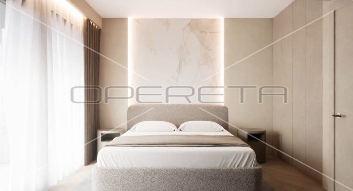 Luksuzan dvoetažan četverosoban stan zatvorene površine 105m2, vrt 109m2, garaža 30,65 m2. Ukupno obračunski NKP 125m2. Sastoji se od predsoblja, dnevnog boravka s kuhinjom i blagovaonicom otvorenog tlocrta s izlazom na terasu i vrt, gostinjskog wc-a na gornjoj etaži, predsoblja, master sobe s garderobom, kupaonicom i izlazom na balkon, dvije spavaće sobe i kupaonice.