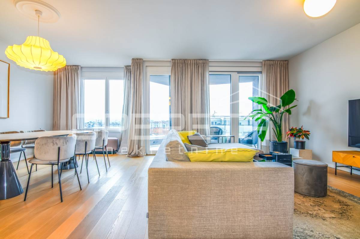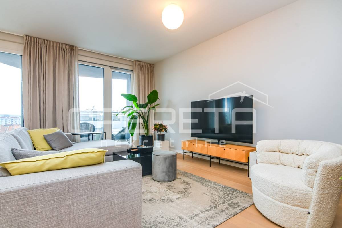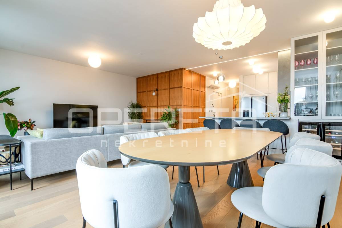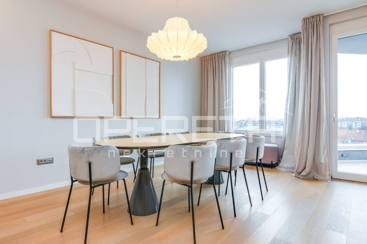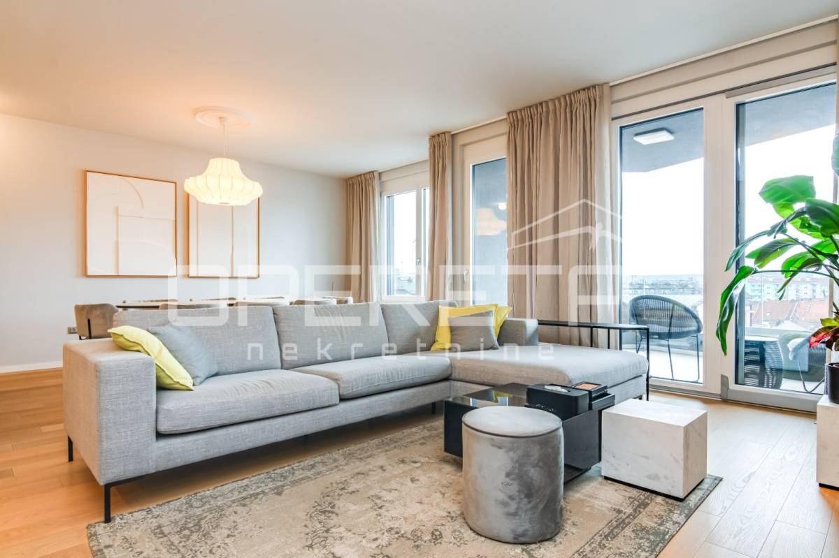 PRODAJA, STAN, ZAGREB, TREŠNJEVKA, PENTHOUSE, 116m2, stan 3s, Trakošćanska ulica. Stan ima 90m2 zatvorenog prostora i sastoji se od dnevne sobe koja sa blagovaonicom i kuhinjom čini veliki i svijetli open space prostor, 2 spavaće sobe sa mogućnošću dobijanja još jedne (originalni tlocrt), kupaonice sa WC-om i jednog odvojenog WC-a. U ukupnu kvadraturu stana su obračunati prema koeficijentu loggia, terasa te velika dupla garaža od 30m2, na -1 etaži zgrade. Stan je luksuzno i dizajnerski uređen, s pažljivo biranim materijalima i namještajem vrhunske kvalitete. Prostor je funkcionalno organiziran, prozračan i bogat prirodnim svjetlom, što stvara iznimno ugodan ambijent za život. Moderno uređena kuhinja, podnop grijanje u cijelom stanu, pvc, klime, kamere... Garaža je posebno uknjižena i nije uvijet za kupnju stana. Ekskluzivan penthouse u centru Trešnjevke,predstavlja rijetku priliku na tržištu te je idealan za Kupca koji traži prestiž, komfor i vrhunsku lokaciju u neposrednoj blizini svih sadržaja – tramvajskih linija, trgovina, restorana, škola i ostalih gradskih pogodnosti.