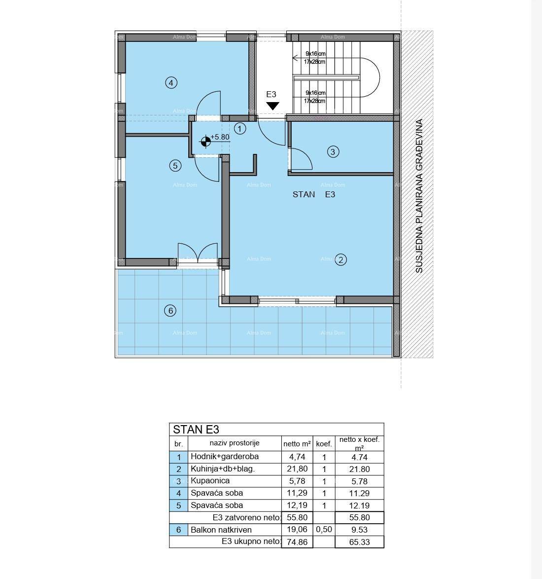 Stan E-3 površine 74.53m2 (reducirane površine 65.17 m2), nalazi se na drugom i zadnjem katu zgrade sa samo 3 stana. Sastoji se od hodnika+garderoba, kuhinje s blagavaonomi dnevnim boravkom, dvije spavaće sobe, kupaone i natkrivenog balkona.