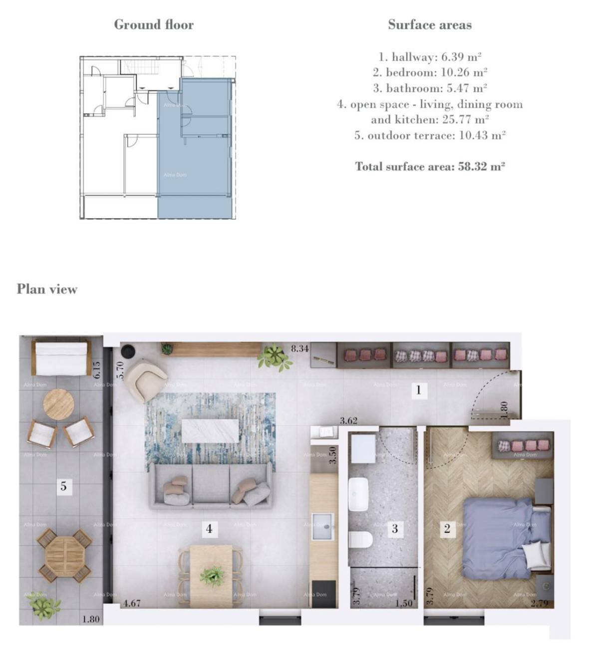 Stan se nalazi u prizemlju i sastoji se od hodnika, spavaće sobe, kupaonice, kuhinje, dnevnog boravka s blagovaonicom i privatnim vrtom.