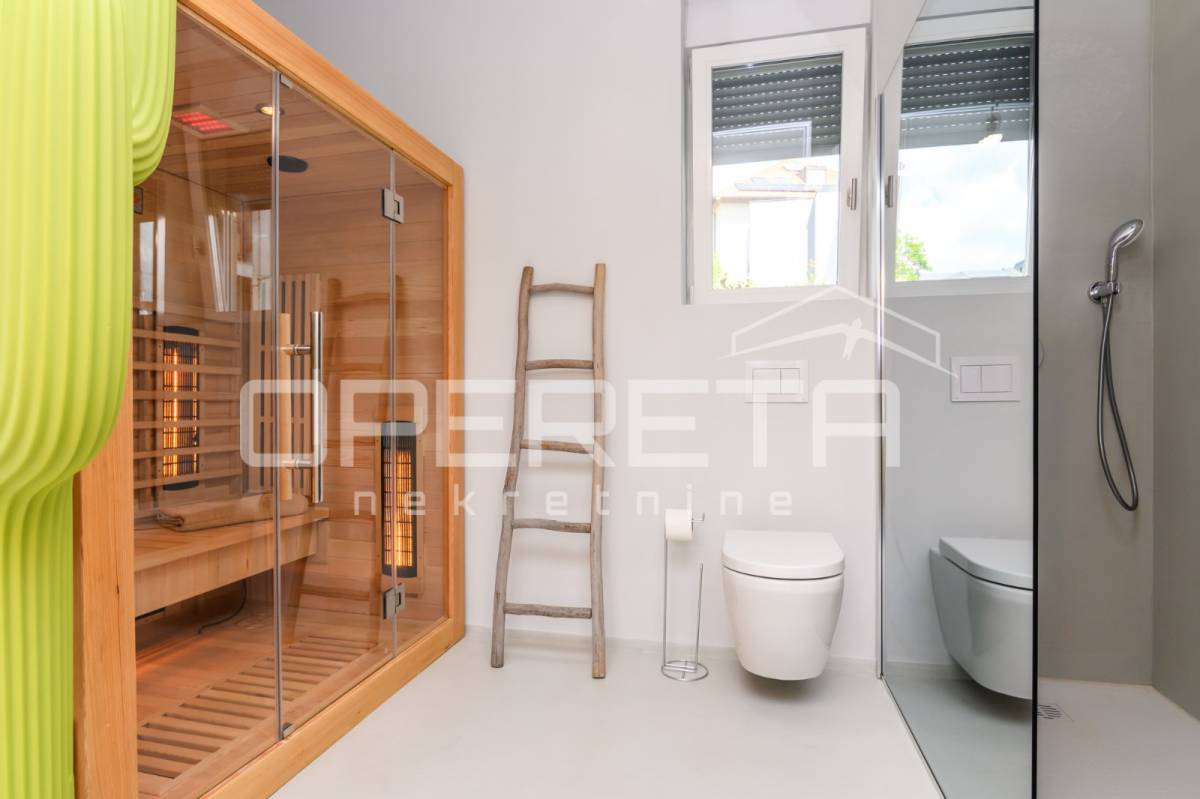 U stanu su promijenjene sve instalacije vode, grijanja, struje, podovi, stropovi i unutarnja i vanjska stolarija, te renovirane garaže. Ugrađen je alarmni sustav, kamere, električni podizači roleta i komarnici na svim prozorima, te infrared sauna i uređaj za filtriranje vode, te sound system Bose. 5 Daikin klima uređaja u svim sobama, različitih jačina. Na podu je postavljen parket Weitzer i mikrocement u bež boji, koji se nalazi u svim kupaonama i toaletu, te dnevnom boravku i kuhinji. Vanjske stepenice i terasa obloženi su u travertin kamen. U dvorištu zgrade nalaze se 3 garaže. Stan se prodaje kompletno namješten.